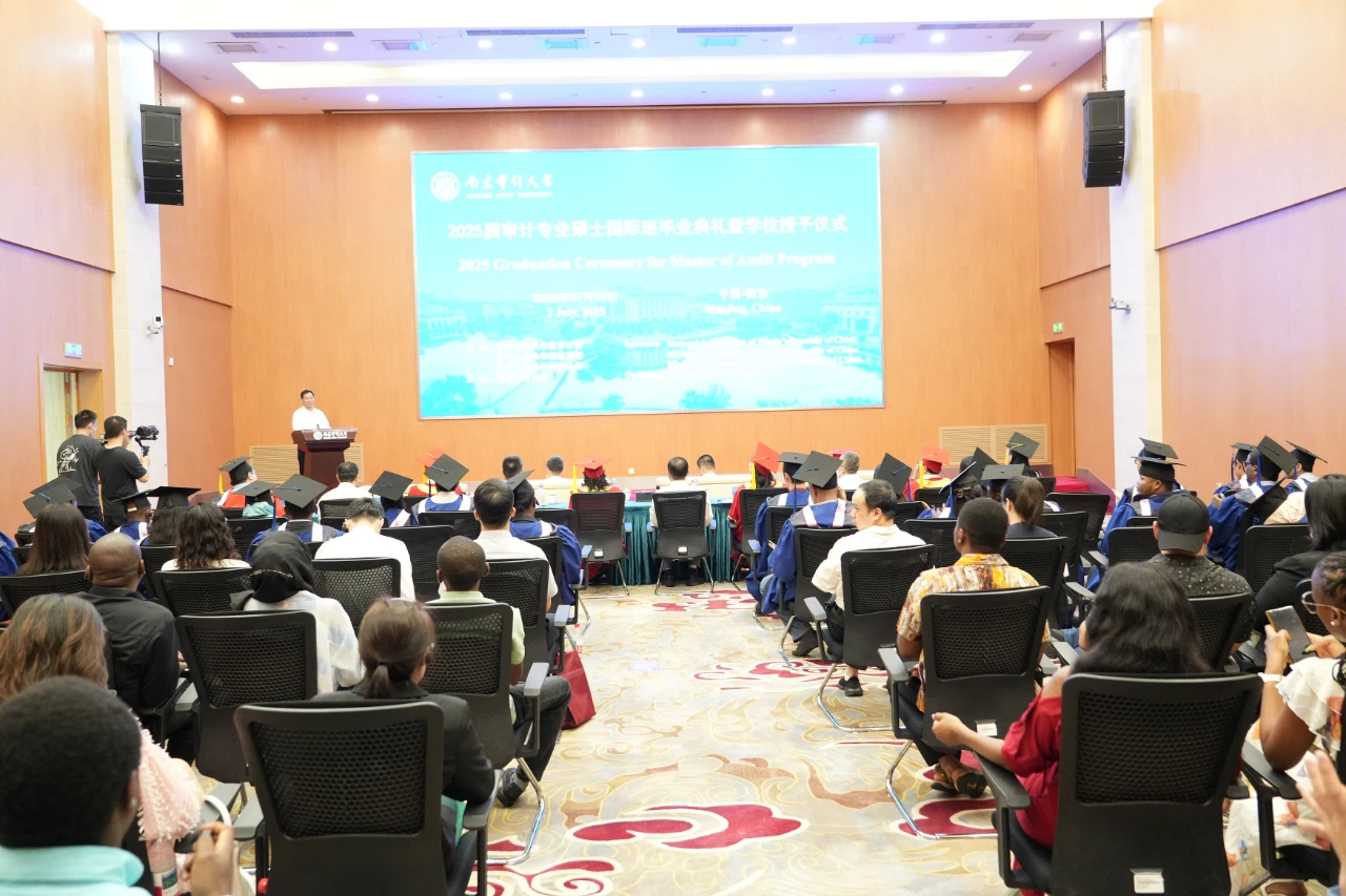 7月2日上午,南京審計大學2025屆審計專業碩士國際班畢業典禮暨學位授予儀式在審計署審計干部教育學院國際報告廳舉行。審計署黨組成員、中央經濟責任審計工作部際聯席會議辦公室主任張俊,國際合作司司長姜海鷹,南京審計大學黨委書記董必榮,黨委副書記、校長陸華良等領導出席典禮。董必榮主持儀式。