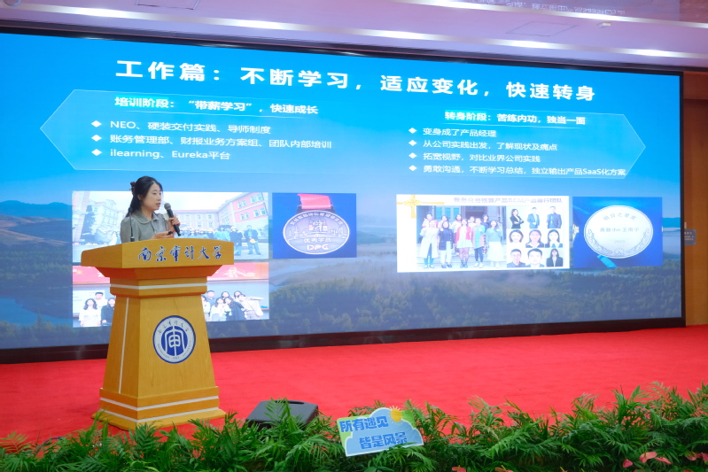 隨后,2022屆校友現任數字能源賬務的王雨寧和青海/西藏終端財經主管的郭鑫平分享了從“南審人”到“華為人”的成長蛻變,她們以親身經歷講述了在華為平臺上所獲得的國際化視野、專業能力的飛速提升以及“奮斗者”文化的深刻內涵,校友們的“現身說法”,為在場的學弟學妹們描繪了一幅清晰而充滿吸引力的職業藍圖,引發了強烈共鳴。
