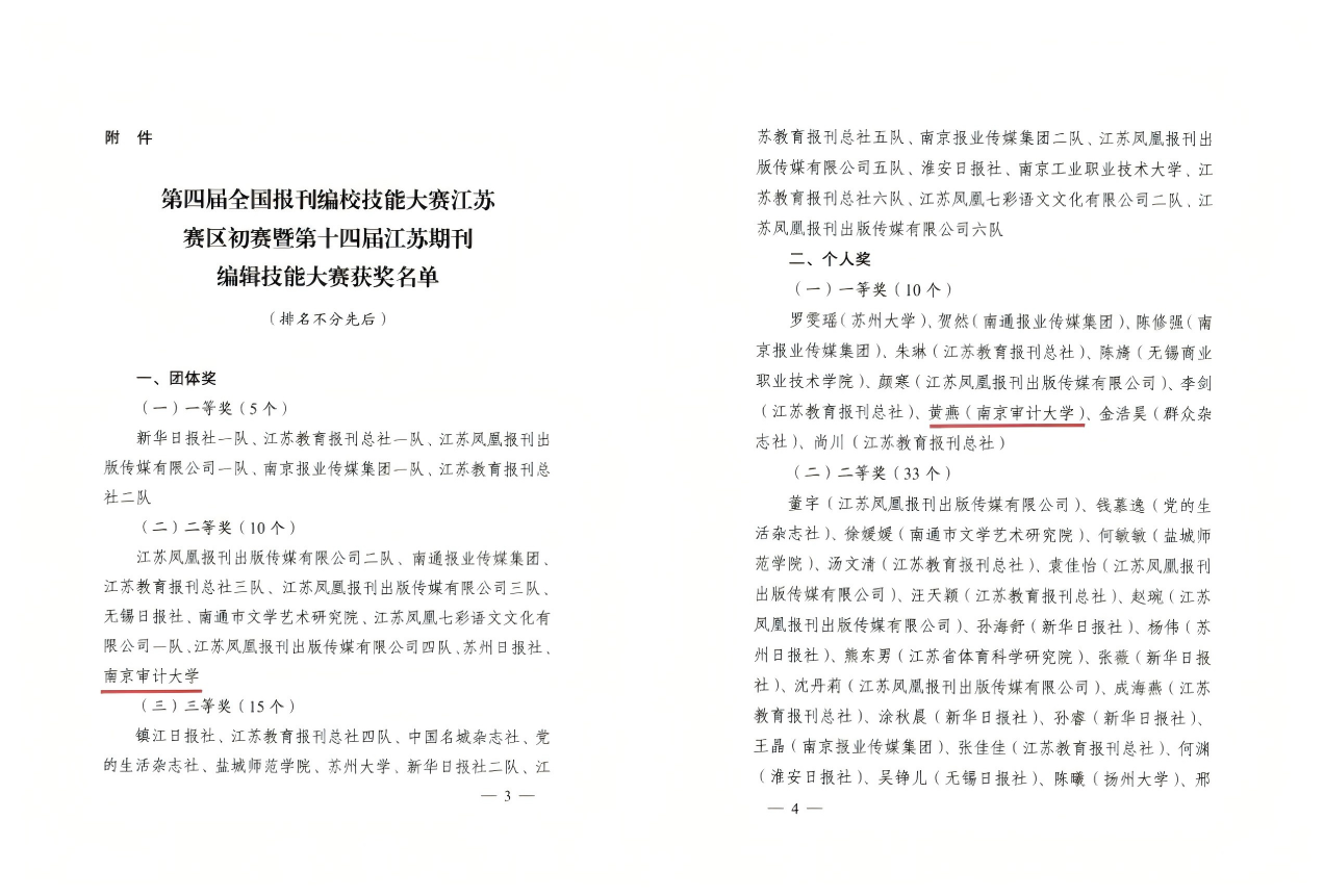 近日,第四屆全國報刊編校技能大賽江蘇賽區初賽公布獲獎結果,我校期刊社黃燕獲個人獎一等獎,由高婷、李思遠、苗竹青組成的團隊獲團體獎二等獎。