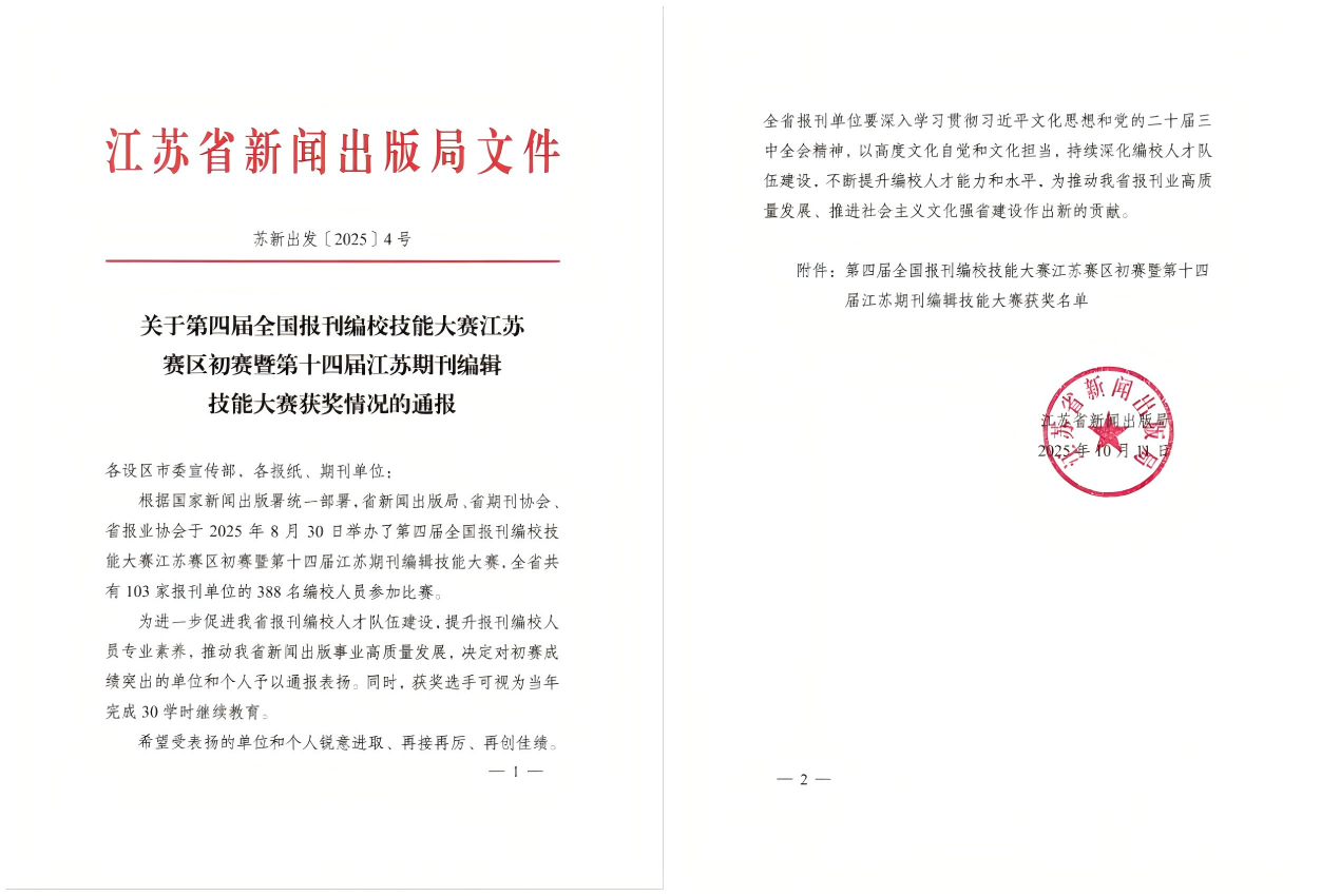 第四屆全國報刊編校技能大賽由國家新聞出版署統一部署,江蘇省新聞出版局、江蘇省期刊協會、江蘇省報業協會聯合舉辦,重點考查編校人員對習近平新時代中國特色社會主義思想特別是習近平文化思想的理解把握,馬克思主義新聞觀的掌握,新聞出版法律法規、職業道德的理解,編校知識、標準規范、編輯加工與內容審讀等專業技能的運用,以及行業新知識新技能的學習應用。