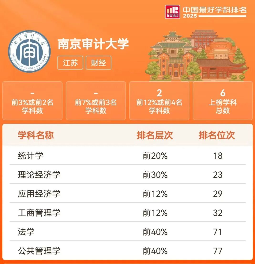 10月15日,高等教育評價專業(yè)機構(gòu)軟科發(fā)布“2025軟科中國最好學科排名”。我校現(xiàn)有8個碩士及以上學位授權(quán)一級學科,本次有6個學科上榜,上榜率75%,涵蓋經(jīng)濟學、法學、理學、管理學等多個學科門類。應用經(jīng)濟學、工商管理學、統(tǒng)計學、理論經(jīng)濟等4個學科位居江蘇省前三名,其中,統(tǒng)計學首次進入榜單前20%,位列江蘇省第一名。近日,教育部公布了最新學位授予單位(不含軍隊單位)自主設置二級學科名單,我校審計學自設目錄外二級學科在列,意味著學??梢栽诠ど坦芾韺W一級學科博士點下單獨招收審計學博士,實現(xiàn)審計學本碩博人才貫通式培養(yǎng)。