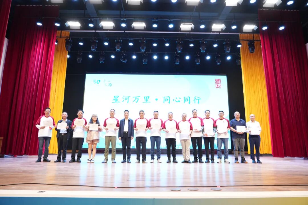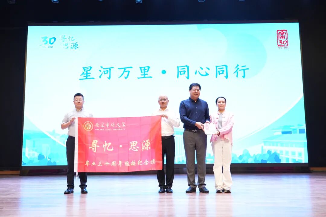 此次返校班級自發捐贈,積極表達對母校感恩之心。現場,李乾文副校長為1995屆校友代表頒發捐贈證書,并贈送校友卡。此外還進行了1995屆校友與1996屆校友“返校紀念旗”和“紀念盤”交接儀式。在校生們為師兄姐們帶來了情景詩朗誦《審計之光·輝映星河》。