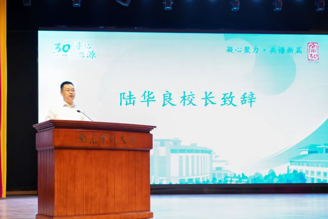 陸華良校長致辭。他代表學校黨政領導、全體師生,對參加返校慶祝大會的各位校友和老師表示歡迎,并詳細介紹了學校辦學來的發展成就。他表示,南審創建于1983年,辦學歷史可追溯至1951年。三十年前,大家從母校揚帆起航,將校訓精神融入血脈,在各個領域辛勤耕耘,為國家經濟發展和社會進步注入了強勁動力,為母校贏得了廣泛的社會聲譽,校友們身上所展現的南審校友文化與精神是引領所有在校學生奮發有為、薪火相傳的強大力量。他期望,校友們?;啬感?,共敘情誼,感受校園新貌,持續為母校高質量發展建言獻策、匯聚力量。
